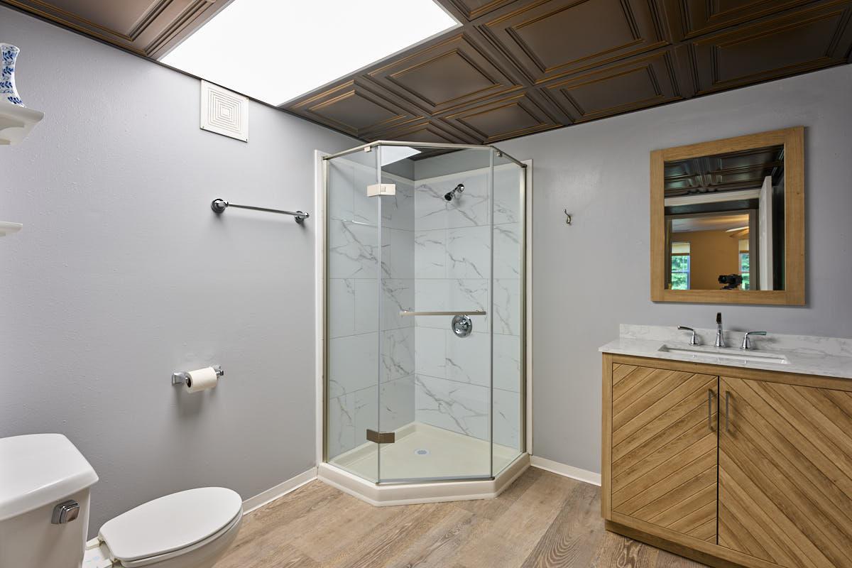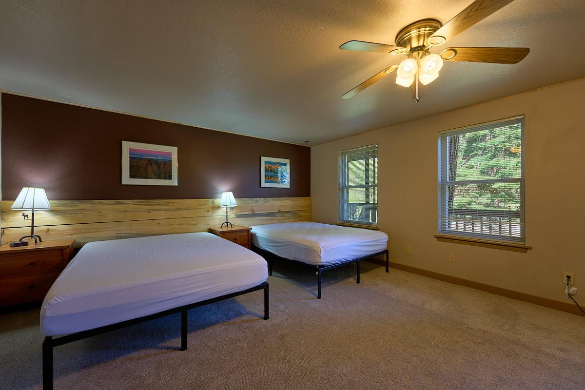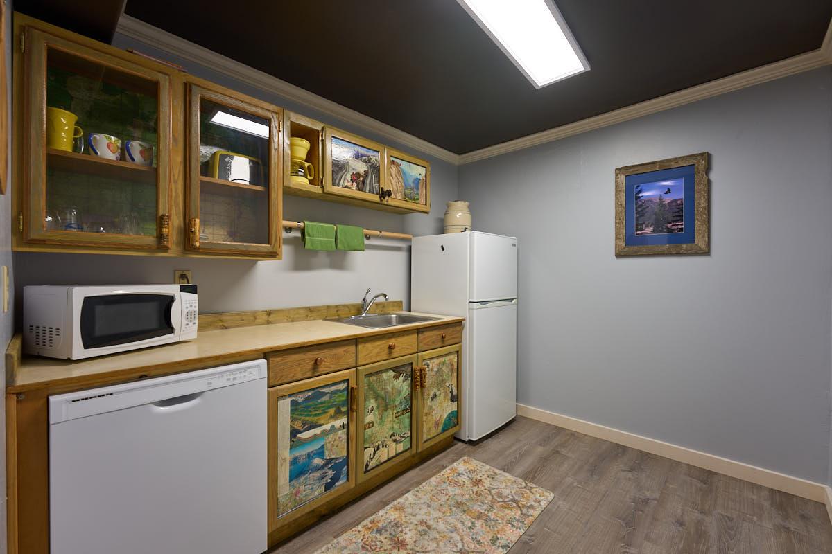 The suite's kitchenette comes with dishwasher, full-sized fridge, coffee maker, toaster and microwave (no oven). A gas grill is located on the deck outside. In the living room you'll find comfortable reclining couches, a propane furnace to keep you cozy and a huge picture window looking towards the mountains. In the bedroom there are 2 queen beds, each with its own nightstand and lamp, a clothes hangerm ironing board and luggage stand. The bathroom includes a shower (no tub).